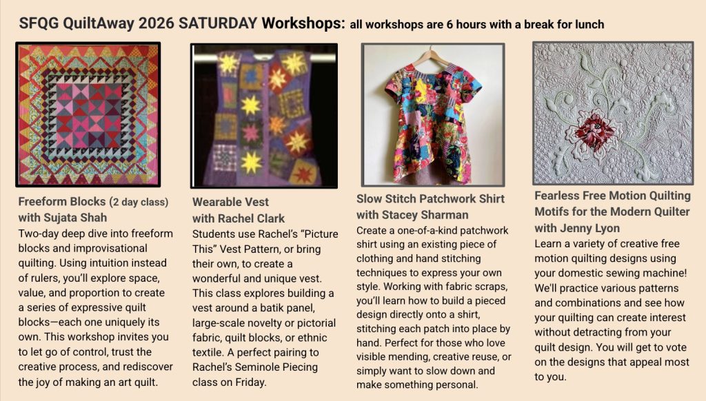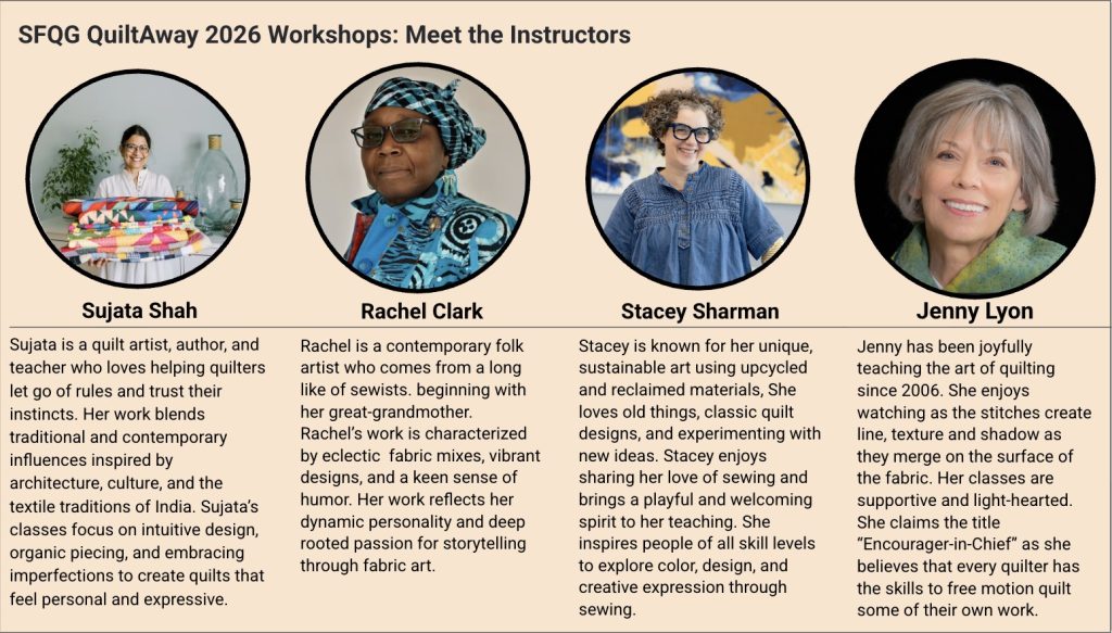 QuiltAway is back with all of your favorite traditions of our past QuiltAways and a few new ones! Join us for a long weekend of connection and community featuring a dynamic line up of instructors, an open studio option, free table, show & tell, evening programs…and much more!